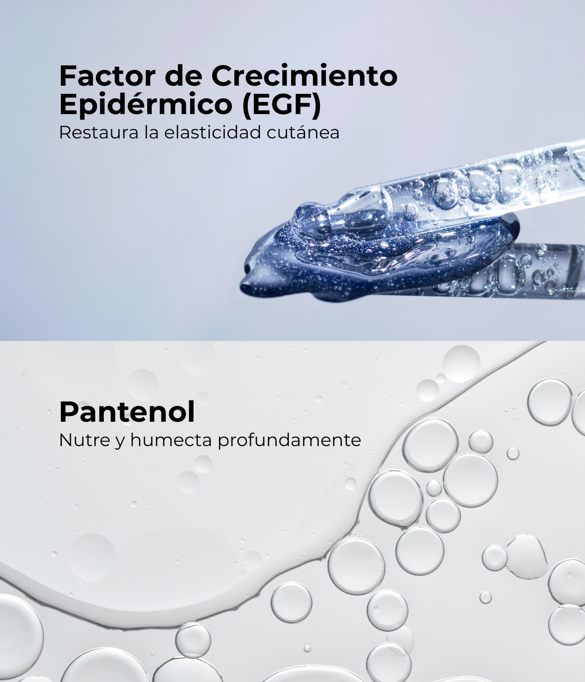 Ampolleta concentrada con Factor de Crecimiento Epidérmico (EGF) que hidrata, revitaliza y mejora la elasticidad de la piel. Reduce arrugas y aporta un efecto antiage visible, para una piel más firme y rejuvenecida.