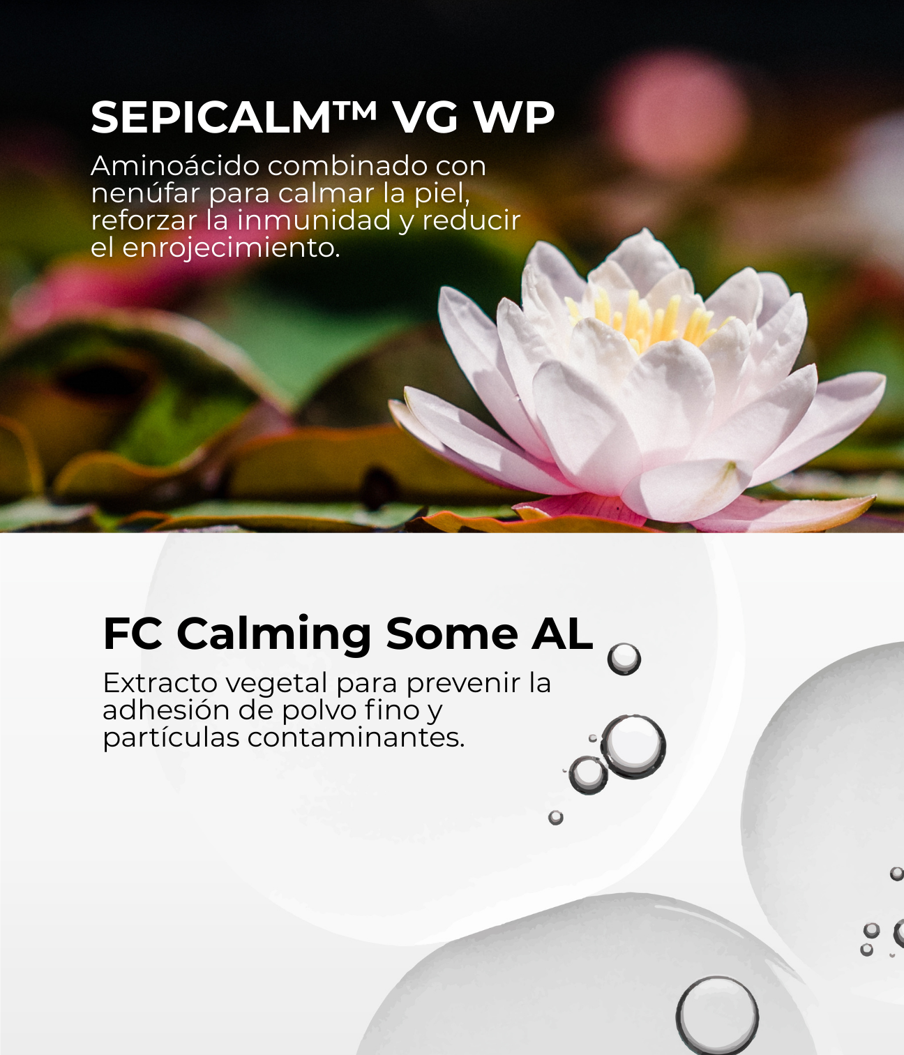 FC Calming Some AL: Extracto vegetal formulado para prevenir la adhesión de polvo fino y partículas contaminantes. Ayuda a mantener la piel limpia y protegida.
