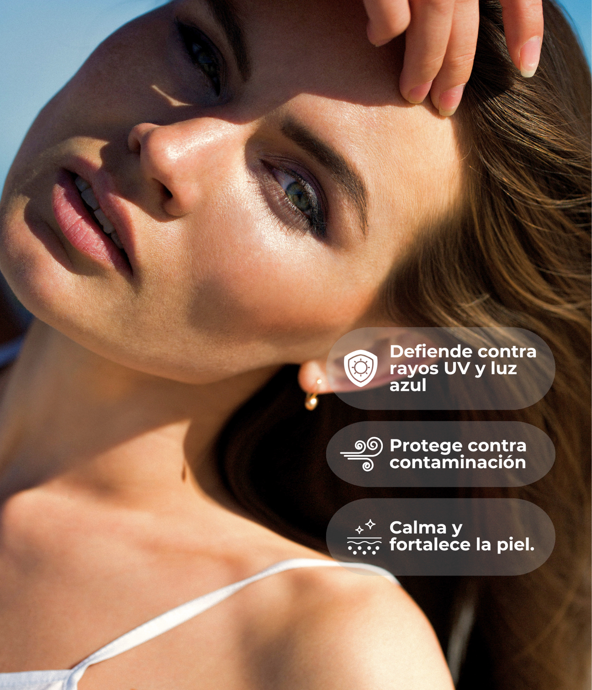 Protección diaria multifuncional con textura ligera tipo esencia. Se funde en la piel sin dejar residuos ni sensación pegajosa, mientras protege frente a rayos UV, luz azul y partículas contaminantes.