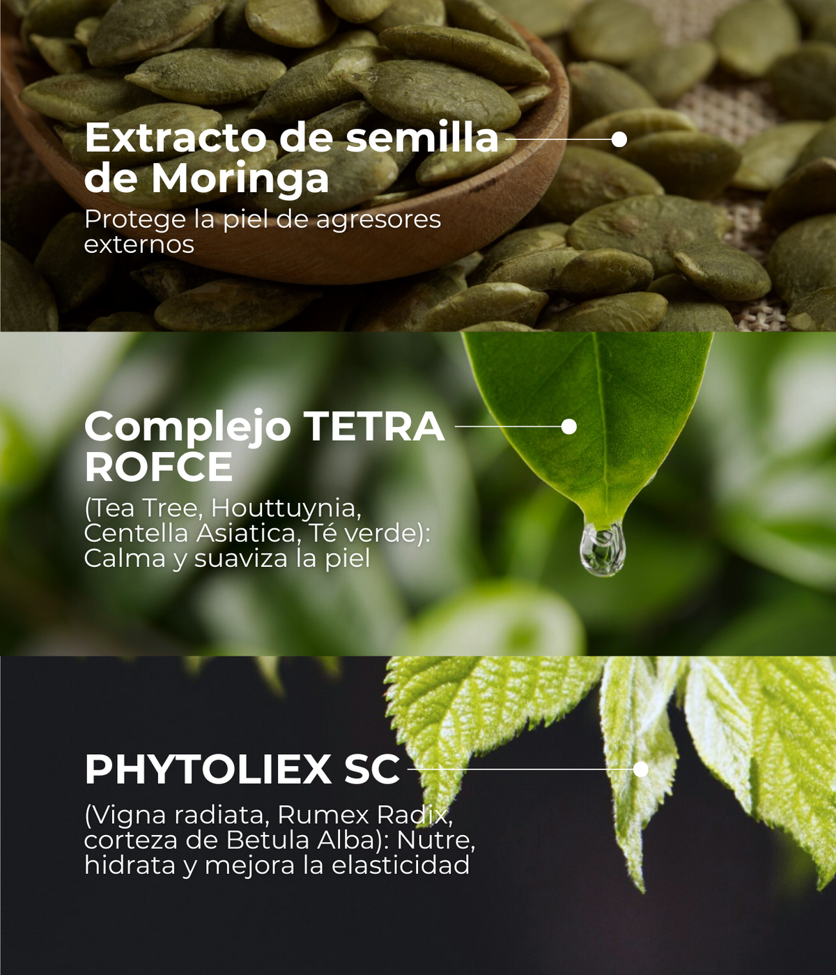 PHYTOLIEX SC (Vigna radiata, Rumex Radix, corteza de Betula Alba): Nutre, hidrata y mejora la elasticidad